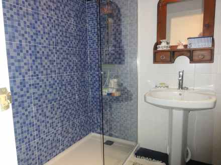 Stor brusekabine med lav kant, håndvask, toilet og bidet
