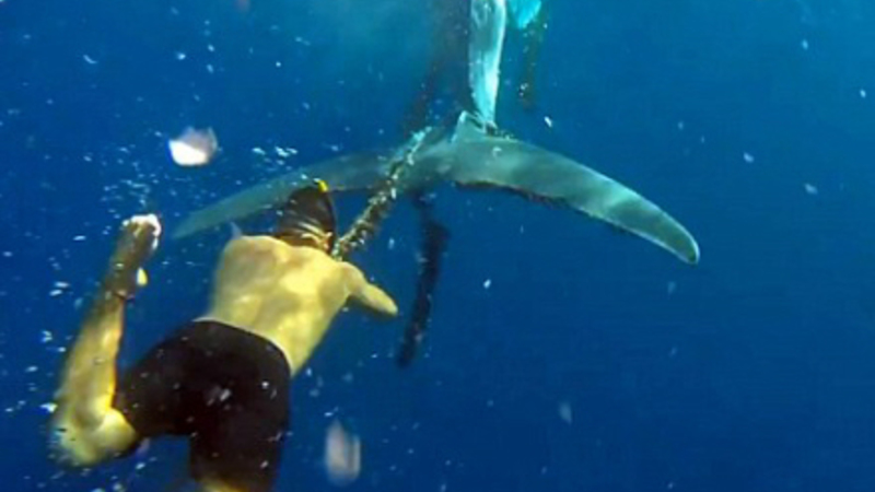 Ulovligt fiskenet kunne have taget livet af en hval, hvis ikke Cesar Espino var kommet det store dyr til undsætning.