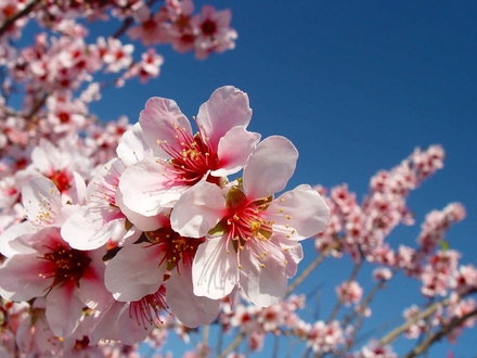 Netop nu står mandeltræerne i fuldt flor. Bjergskråningerne er dækket med et tæppe af de hvid-lyserøde blomster, der gør landskabet til det smukkeste på året.