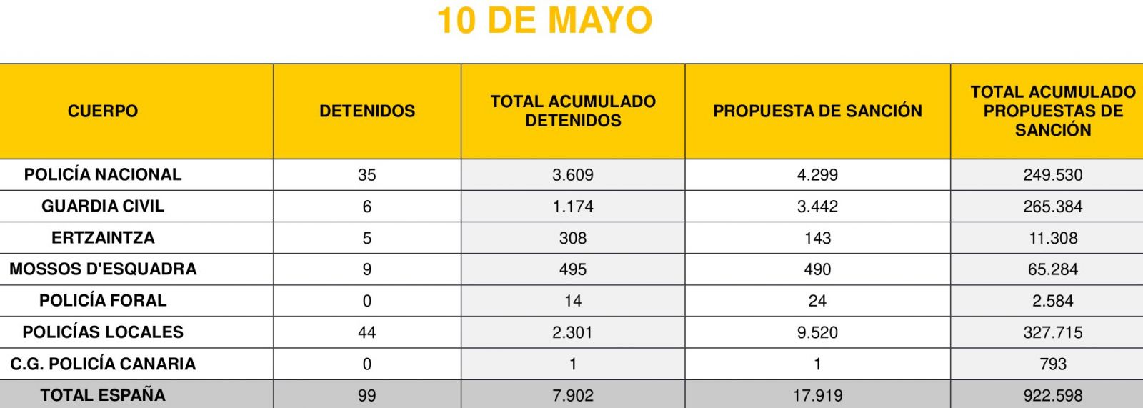 Alene den 10. maj blev der i hele landet uddelt 17.919 bøder og anholdt 99 for overtrædelser af de foranstaltninger, der er vedtaget inden for rammerne af alarmsituationen.