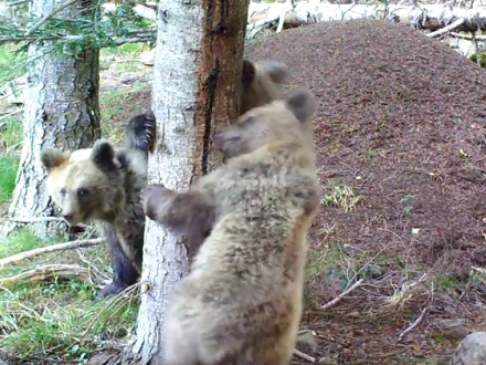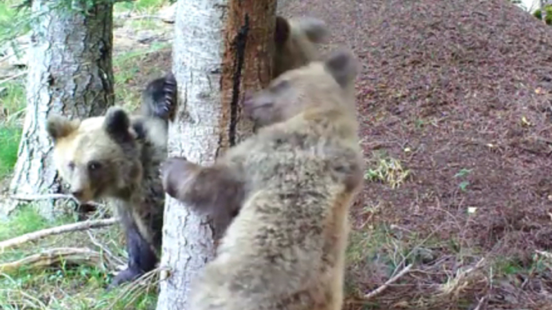 En familie af spanske bjørne er blevet optaget på video, mens de små tappert forsøger at klatre et træ i de spanske Pyrenæer.