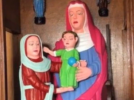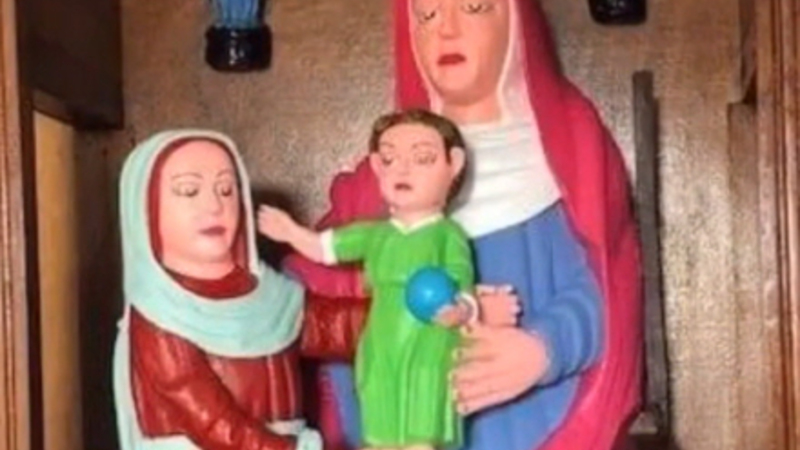 Jomfru Maria er blevet klædt i et skrigende pink hovedklæde og matchende læbestift, mens Jesusbarnets tøj har fået samme grønne farve som Kaj fra Kaj og Andrea.