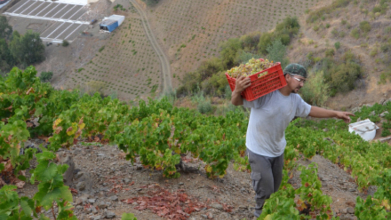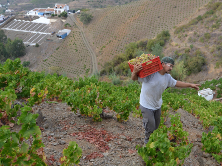 VI ser hvordan man dyrker vin på en helt speciel måde: Vinrankerne holdes helt nede ved jorden, og det er et hårdt arbejde at kultivere og plukke druerne. På de stjle skråninger kan man nemlig kun bruge mands- og muldyrskraft.