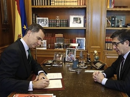 Felipe VI har i dag på sit kontor på Palacio de la Zarzuela underskrevet et dekret, der opløser parlamentet, og dermed har han udskrevet nyvalg den 26. juni. Det skete præcis klokken 9:37.