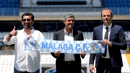 Michael Nicolás Santos Rosadilla, ny spiller fra Uruguay, flankeret af sportsdirekør Arnau (til venstre) og én af Málaga FCs rådgivere Francisco Aquilar