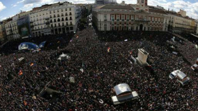 Spaniens rebelske venstrefløjsparti Podemos er klar til at vælte regeringen ved næste valg. Hundredtusinder af utilfredse borgere i alle aldre og samledes lørdag i en af de største demonstrationer, der er set i Madrid nogen sinde.