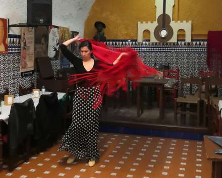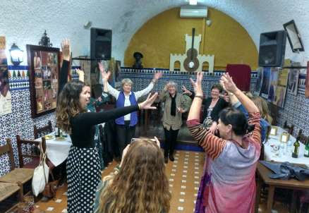 Flamenco baren gik godt. Først med solnedgang på toppen af bymuren med et glas Fino i hånden, derefter tapas og som en overraskelse kom Elena og underviste i dansen ‘Sevillanas’.