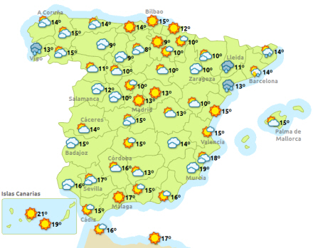 Ifølge Picazo kommer der regn i Cáceres, Sevilla, Córdoba og Cádiz den 24., 25. og 26. marts; i Granada den 25. og 26. og i Málaga kun den 25. Bedste vejr forventes i Murcia, hvor der kun kan blive lidt overskyet af og til, men ellers står den bare på solskin.