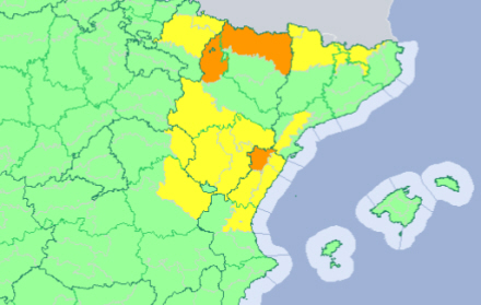 Værst bliver det i Zaragoza, Huesca og Castellón, hvor man er helt oppe i næsthøjeste alarmberedskab. De andre provinser er i gult.