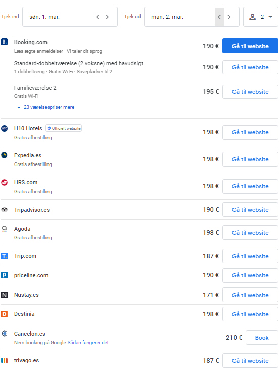 Prisen for et dobbeltværelser ligger på lige under 200 euro i døgnet.