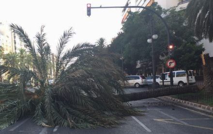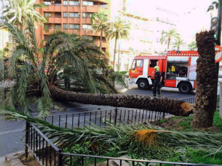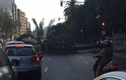 Uheldet i går skete på Gran Vía de Germanías ud for nummer 16 meget tæt på Calle Castelló. Den otte meter høje palme knække over helt nede ved stammen og spærrede al trafik på kørebanerne mod tunnellen til La Gran Vía Ramón y Cajal.