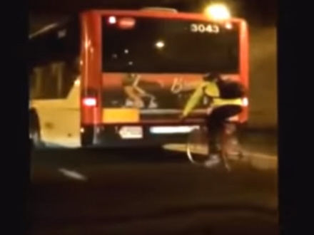 Videoen er lagt på youtube af en bilist, der ikke kunne undgå at lægge mærke til cyklisten, der bragede af sted på vejene i Barcelona lige i halen af en bus.