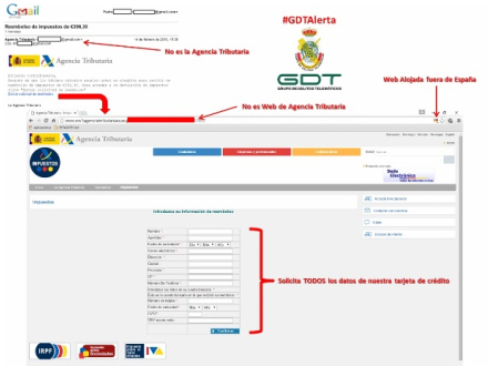 El Grupo de Delitos Telemáticos de la Unidad Central Operativa, UCO, fra Guardia Civil, advarer om, at kriminelle grupper forsøger at luske bankoplysninger ud af skatteyderne ved at benytte de sociale medier eller email til at oplyse om, at der er sket noget skattemæssigt - for eksempel at folk skal have penge tilbage.
