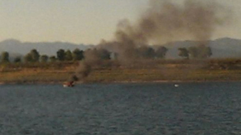 Brandfolk ankom til dæmningen og prøvede at få kontrol over båden, som styrede mod den modsatte bred, der er tæt bevokset af fyrretræer.