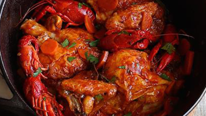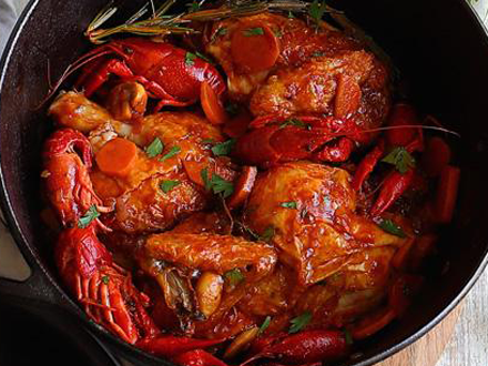 I mellemtiden steges svampene i olivenolie på en pande. Når svampene er halvt færdige, tilsættes krebsene. Lad det stå i 1 minut, og tilsæt cognac. Lad alkoholen fordampe, fjern den og tilsæt den til kyllingegryden, når gryderetten har stået i 30 minutter.