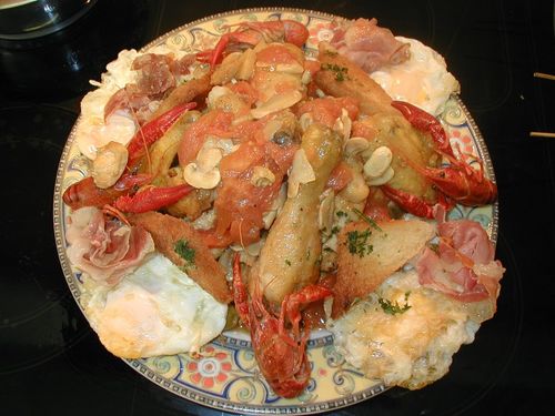 Bonapartes kok, Dunand, var løbet tør for forsyninger og sendte flere soldater ud for at plyndre de omkringliggende gårde. De kom snart tilbage med en god mængde høns, hvidløg, æg, olie og krebs. Med disse ingredienser - suppleret med noget cognac - lavede kokken en ny og lækker opskrift.