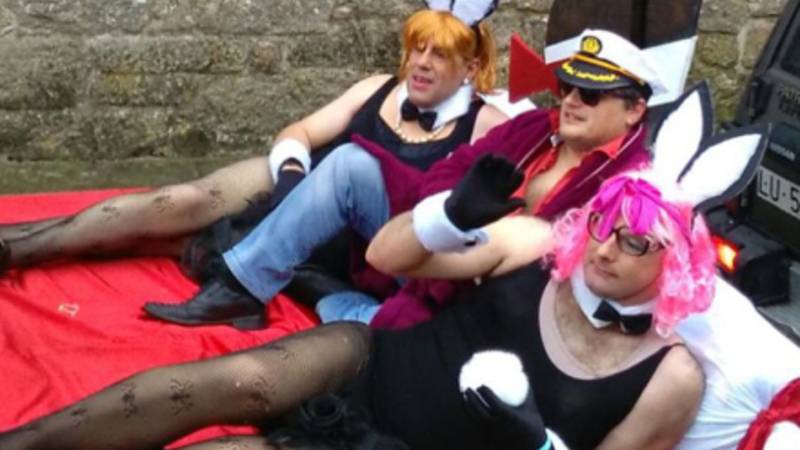 Klædt ud som Playboy-stifteren Hugh Hefner komplet med badekåbe, kaptajnhat og cigar, kørte præsten på en paradevogn gennem Cuntis’ gader.