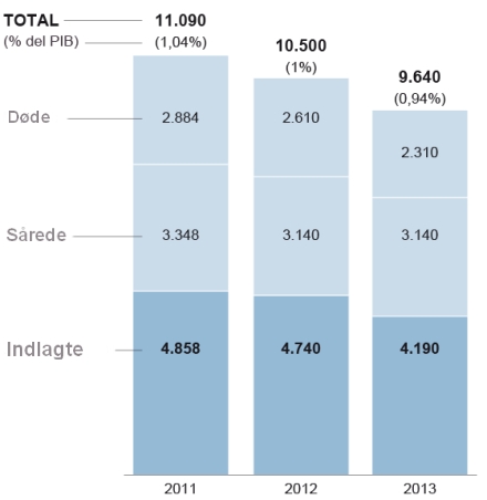 Langt den største udgift ved ulykkerne, som det fremgår af grafikken, er omkostningerne ved hospitalsindlæggelserne, der udgår 4,19 milliarder euro, dernæst 3,14 milliarder euro til de sårede og endelig 2,31 milliarder euro til de omkomne.