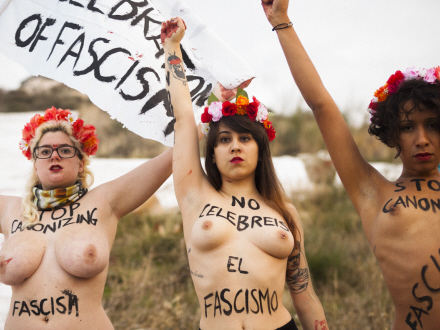 En gruppe modstandere fra den feministiske gruppe FEMEN har markeret deres modstand ved at male budskabet ”Stop 20N” på det store kors Cruz de Paracuellos i nærheden af Madrid.
