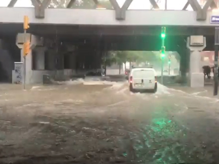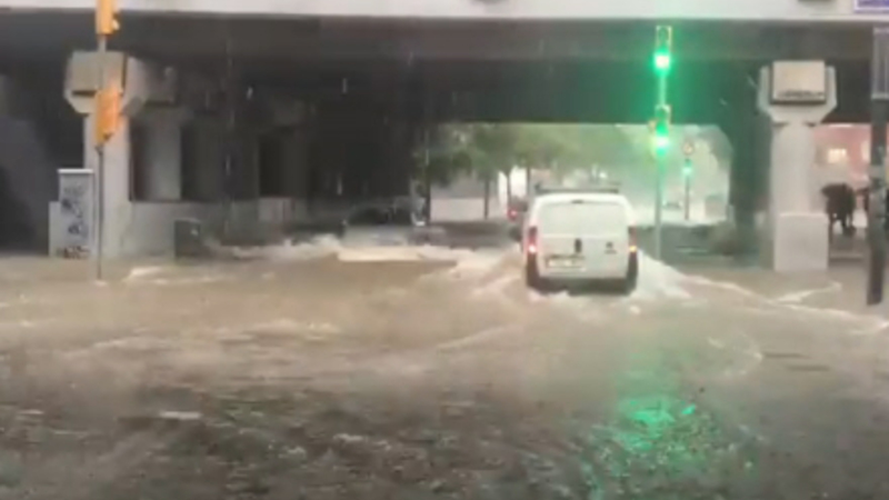 VIDEO: Flod går over sine bredder, og myndighederne har hævet alarmniveauet til det næsthøjeste i Málaga samt i Barcelona, hvor trafikken er helt lammet flere steder.
