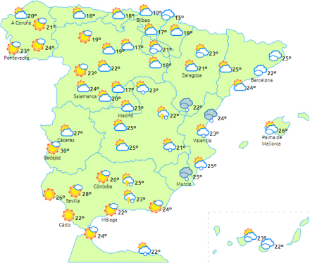 Tiltagende skydække i dagtimerne over den nordlige halvdel og den østlige tredjedel af halvøen med byger og torden, der kan være lokalt ret heftige i den øvre Ebro-dal i løbet af dagens første halvdel og i midten af Ebro-dalen og det østlige Castilla y León i den anden halvdel af dagen.