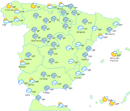 Skyet til overskyet med regn i den sydvestlige del af Castilla y León, Extremadura, Castilla-La Mancha og Andalusien, med lokalt tunge og/eller vedvarende nedbør i Extremadura, det vestlige Andalusien og Strædet, hvilket kan brede sig til andre områder i den sydlige halvdel af halvøen.