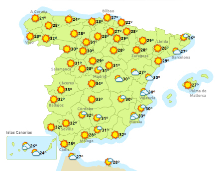 Vejret i Spanien, onsdag klokke 14:00
