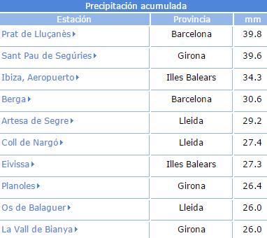 I går kom der ret voldsom nedbør flere steder, men værst var det i Prat de Lluçanès, Barcelona, hvor der faldt 40mm. Girona og Ibiza var dog ikke langt efter: