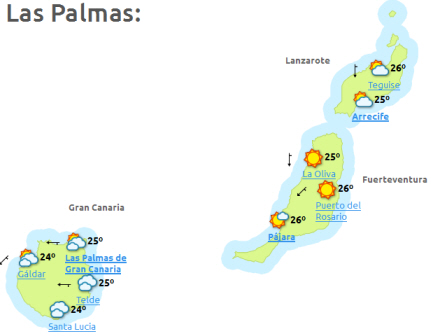 Onsdag stiger temperaturerne i det vestlige Andalusien, mens de falder i de nordlige og indre egne af halvøen og på Balearerne. Højeste temperaturer finder vi i dag i Las Palmas og Santa Cruz de Tenerife med 27 grader, 26 grader i Córdoba og Murcia, mens den kan snige sig op på 25 grader i Granada, Huelva, Málaga og Sevilla.
