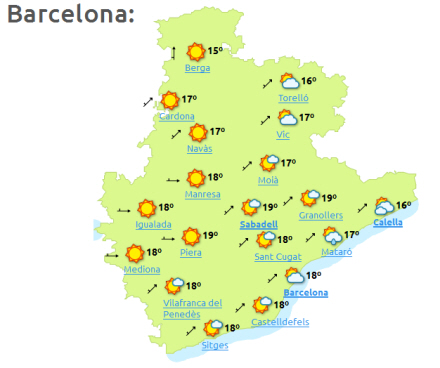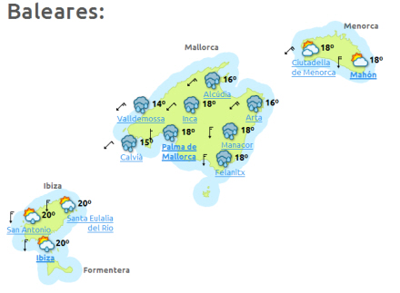 I dag skyet til helt overskyet himmel og regn i det nordøstlige Catalonien og på De Baleariske Øer, som i løbet af første halvdel af dagen bliver værst. På De Baleariske Øer bliver det meget blæsende.