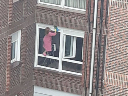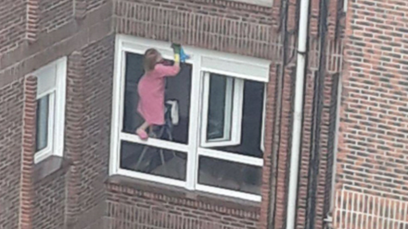 En kvinde i bygningen overfor valgte at trodse døden i rengøringens hellige navn.