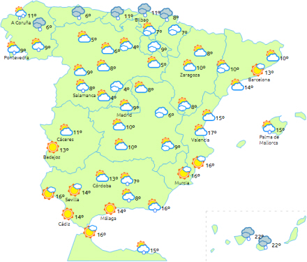 Et ny Atlanterhavsfront bevæger sig fra nordvest til sydøst og efterlader skyet himmel og nedbør til det meste af halvøen og Balearerne. Selv De Kanariske Øer får noget nedbør:
