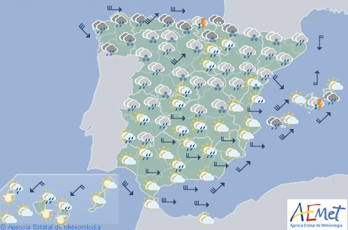 Massivt snefald i bjergrige områder på den nordlige del af halvøen, mens der bliver tale om vedvarende og lokalt stærkt regn i Galicien og Cantabrien, og sandsynlighed for lokalt kraftig regn på Balearerne.