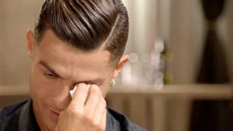 Da intervieweren Piers Morgan så afspiller en video af Ronaldos far, hvor han taler om, at han er meget stolt, er Ronaldo helt færdig, og tårerne pisker ud af øjnene på ham.