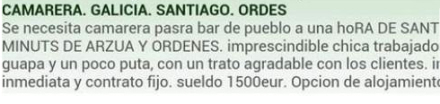 "Servitrice søges til landsbybar beliggende en time fra Santiago og 15 minutter fra Arzúa y Órdenes. Uundværlig, arbejdsom og ansvarlig, smuk og lidt tæve-agtig pige, der kan give kunderne en dejlig behandling. Med start øjeblikkeligt og med fast kontrakt, løn på 1.500 euro. Mulighed for at overnatte, hvis du kommer langvejs fra."