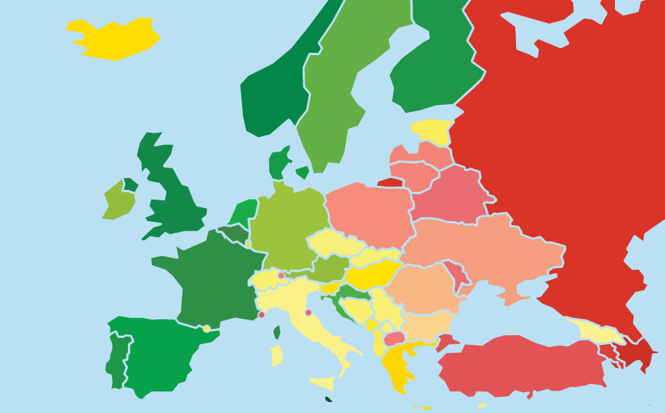Kortet viser LGBT-rettigheder i Europa. Grøn er bedst, rødt er værst. (foto: ILGA-Europe)