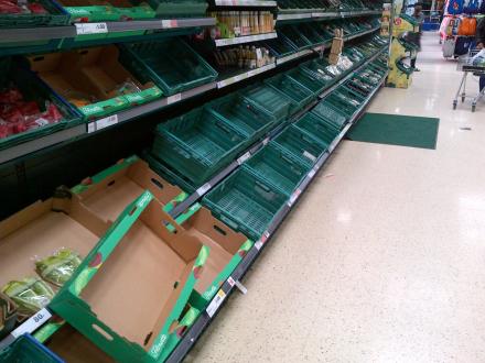 I Tescos butikker fremgår det af skilte på hylderne, at man kun må købe tre hoveder icebergsalat om dagen. Den samme rationering gør sig gældende for broccoli.