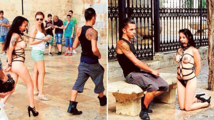 Hændelsen fandt sted torsdag eftermiddag nær det historiske monument, hvor en mand kom gående med en halvnøgen kvinde i snor. Kæden om halsen og den dertilhørende ydmygelse tilfredsstillede åbenbart kvinden. En stor gruppe af forbipasserende standsede op og så måbende til, da den masochistiske scene udspillede sig.