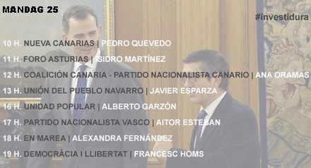 Samtalerne med Kongen sker i den rækkefølge, at de mindste kommer først. Den sidste på dagen er nuværende Premierminister i funktion, Mariano Rajoy.