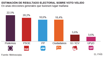 En meningsmåling foretaget af Metroscopia for El País viser, at de to store partier, de konservative (PP) og socialisterne (PSOE), som siden slutningen af 1970'erne har siddet tungt på magten, nu skal til at dele ud af indflydelsen.