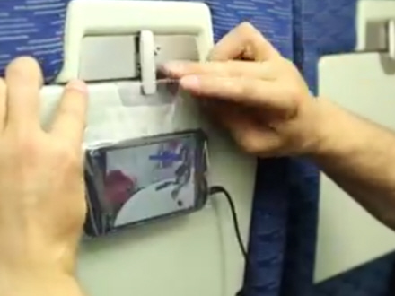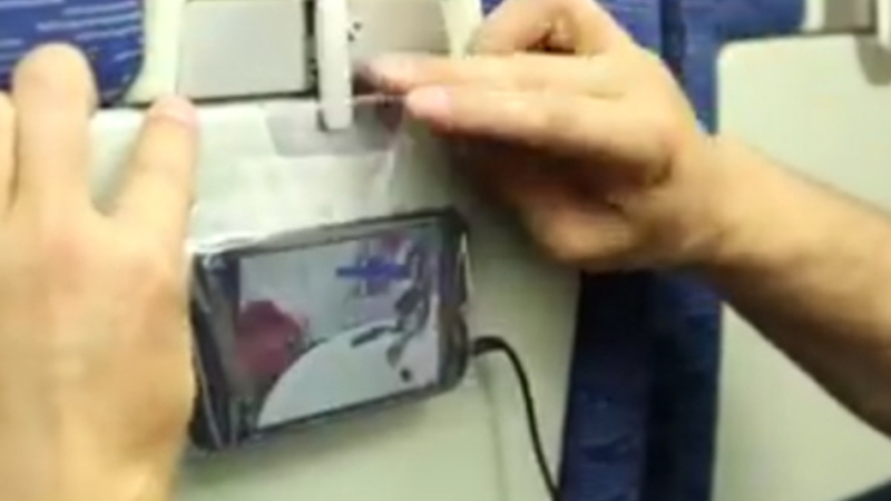 Hvis du rejser i bus, tog eller fly, kan du medbringe din mobil til at se film på. Tag en kraftig, gennemsigtig frysepose med hjemmefra. Læg mobilen i og spænd posen fast til knappen – eller noget andet - på bagsiden af sædet foran dig. Det er selvfølgelig ikke det samme som en solid storskærm, men det virker. Og så kan du selv vælge underholdningen.