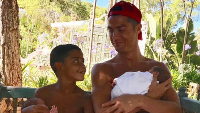 7-årige Cristiano Jr. holder sin lillesøster, mens Real Madrid-stjernen selv holder Mateo.