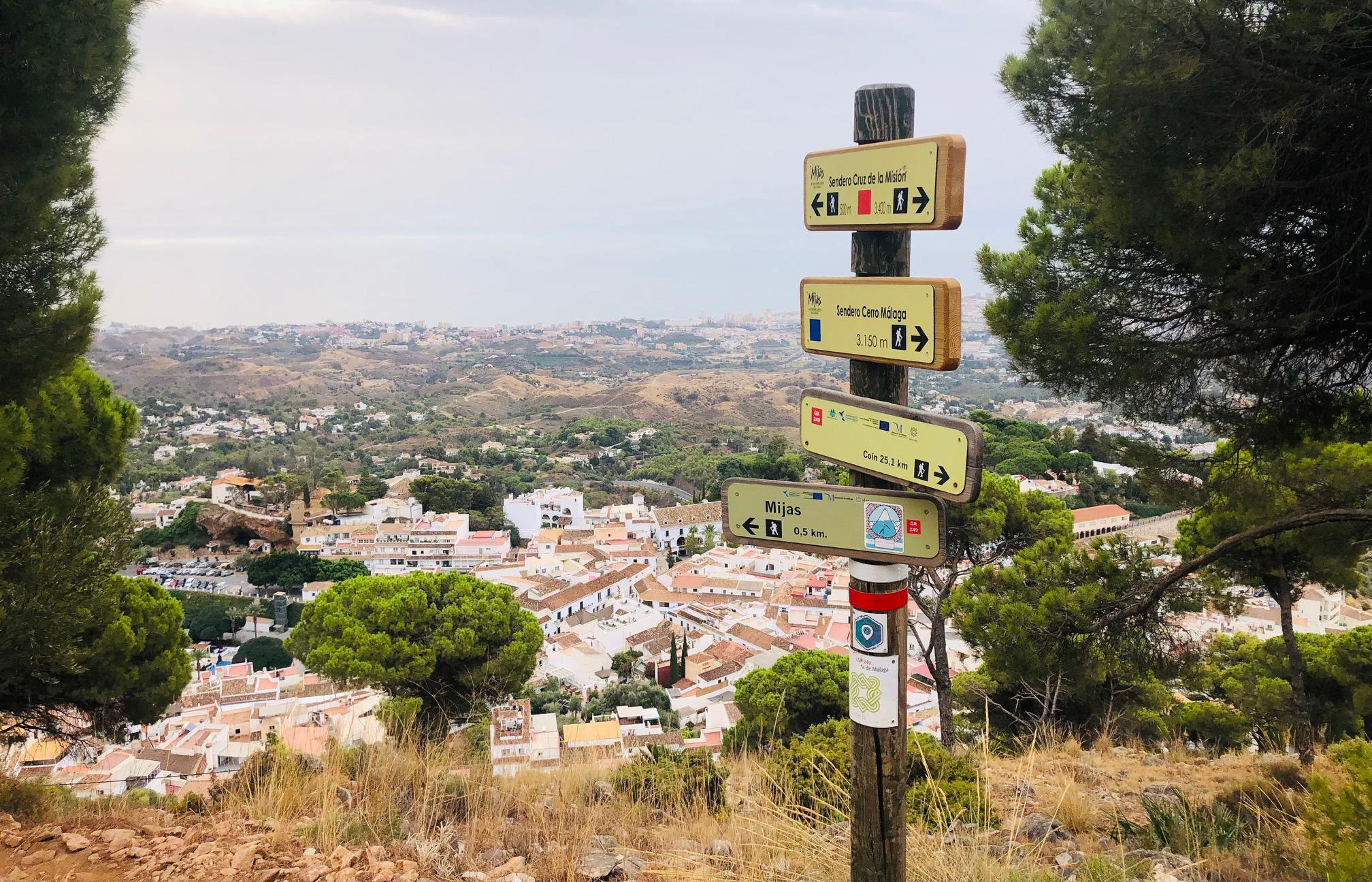 På bjerget lige oven over turistperlen Mijas Pueblo er der seks forskellige ruter at vælge imellem og to forskellige steder, man kan starte fra. Så kan man for eksempel vælge at gå lidt af den orange, indtil man rammer den lysegule og fortsætte ad den, indtil man rammer den grønne og så gå tilbage til udgangspunktet ad den.