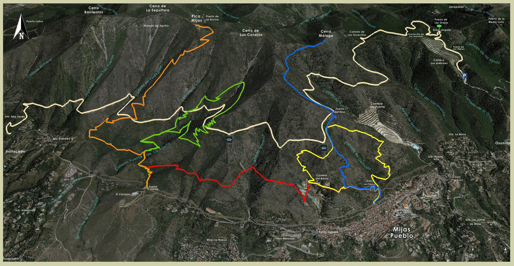 Startpunkter er grusgraven i højre hjørne, plus der hvor blå og gul samt orange og rød mødes. De to starter på vejen over Mijas Pueblo