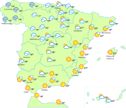 Overvejende overskyet himmel med mulighed for nogle svage og isolerede byger - særligt i bjergene. Let stigende temperaturer på 17 til 23 grader og otte til 15 i nat. Vind fra vest, generelt svag.
