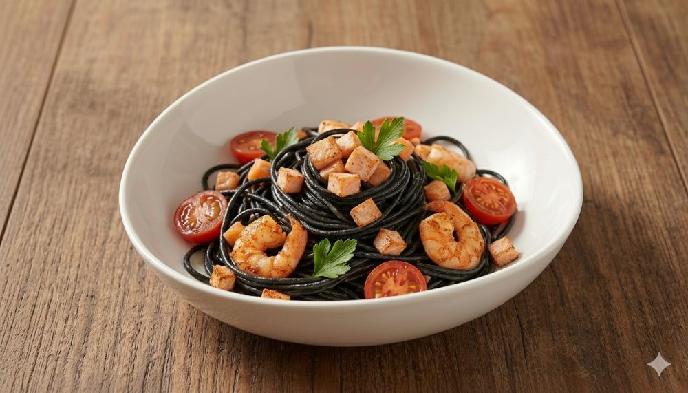 Spaguetti negro con salmón y gambas