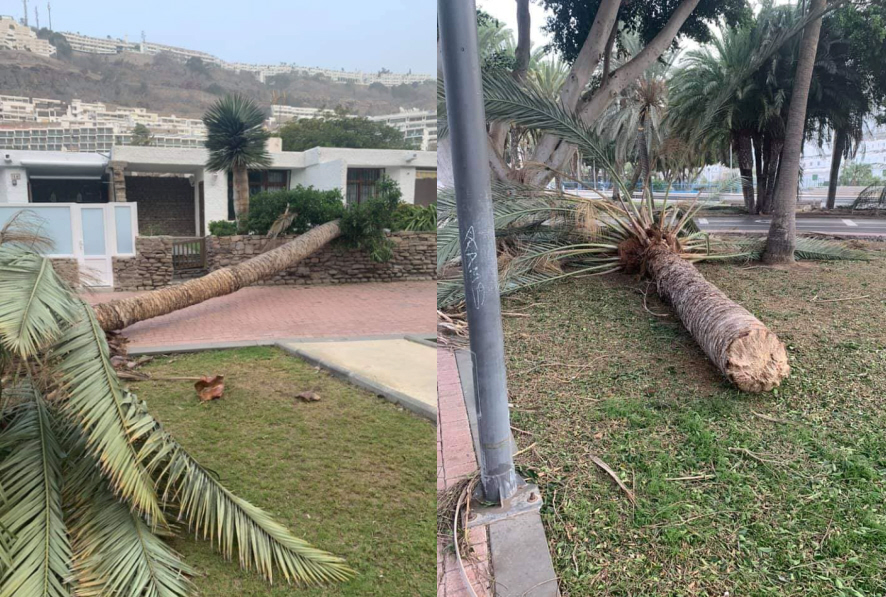 Blæsten har væltet palmer som var de tændstikker