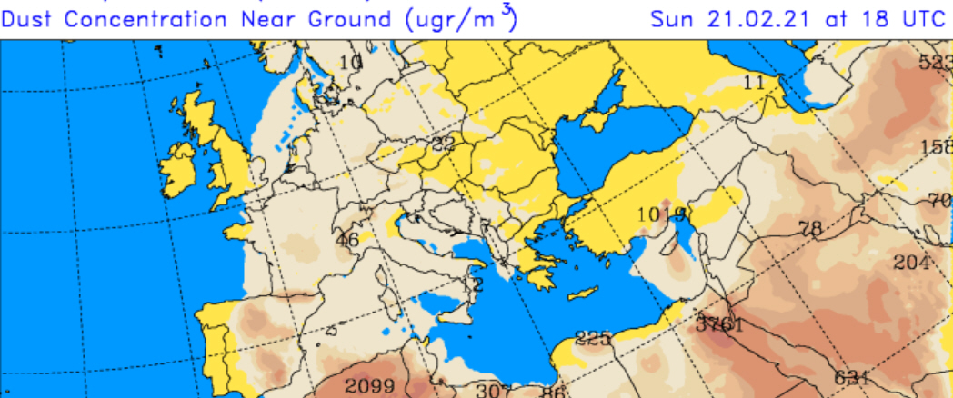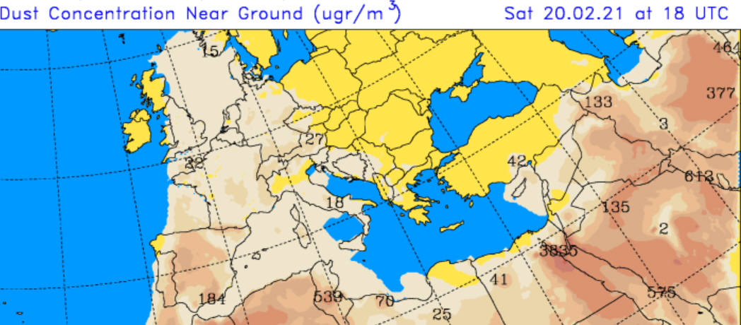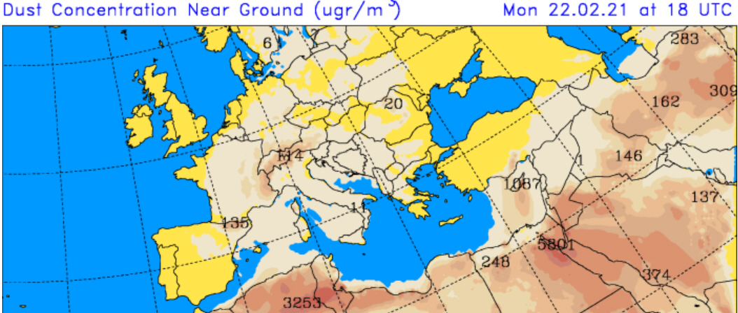 Det er varm vind fra Afrika, der på sin vej gennem Sahara-ørkenen samler en masse støv og sand op, som så forringer sigtbarheden markant og efterlader rødt sand på terrasser og biler.