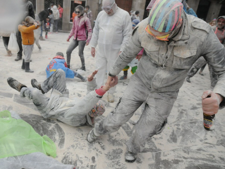 I dag er alle landsbyboerne involveret i kampen, og til sidst ser Plaza Mayor ud som om, der er faldet sne.