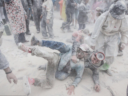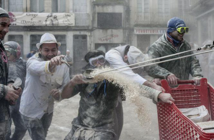 Hundredvis af mennesker samledes i går til en reel gadekamp i centrum af Xinzo, og der var mel altså hovedelementet.